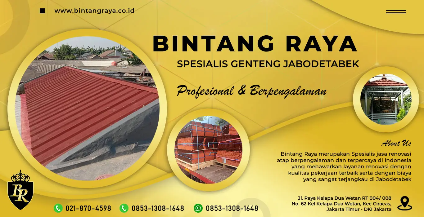 Bintang Raya merupakan spesialis jasa renovasi atap rumah, villa, kantor dan bangunan lainnya yang berlokasi di Jakarta. Kami sangat berpengalaman dalam bidang ini dan telah dipercaya banyak klien untuk kebutuhan renovasi genteng.